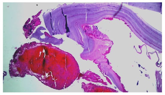 Emergency surgery was performed to treat the acute brachial artery ischemia, as the patient showed early signs of motor deficit. A surgical sample fragment suggesting a ruptured hydatid cyst membrane was histopathologically assessed and confirmed the diagnosis of arterial embolism due to a hydatid cyst membrane fragment. The sample tissue was a fibrino-hematic clot with rich granulocytic inflammatory infiltrates, intense eosinophilia, and included multiple fragments of anhistous membrane (avascular, eosinophilic, retractile, laminated) from the structure of the hydatid cyst. The histopathological aspect was suggestive of a hydatid embolism, seen in Figure 3a–d and Figure 4.