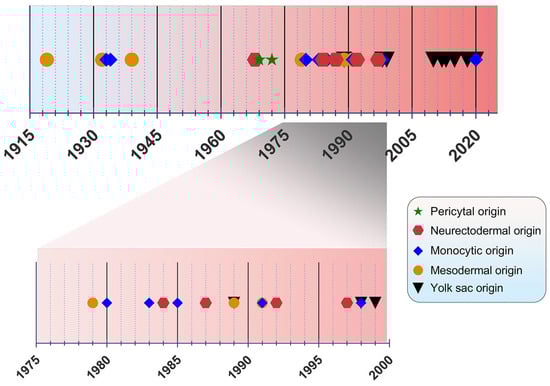 Timeline view of microglial origin since their discovery by Río Hortega.