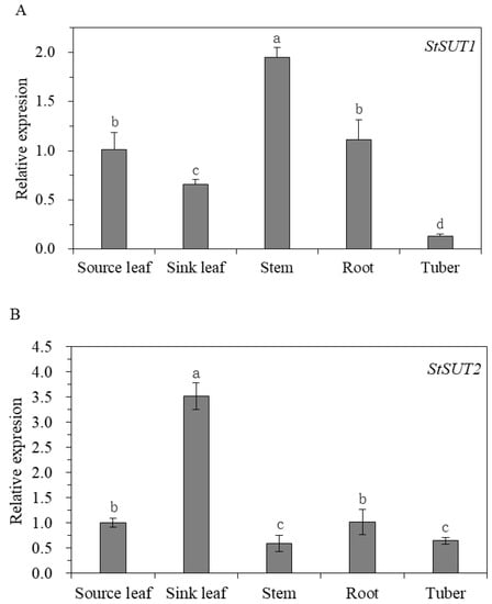 In potatoes, StSUT1, StSUT2, and StSUT4 were isolated []. To determine the gene expression of StSUT1, StSUT2, and StSUT4 in different tissues, qPCR has been performed, and the results indicated that the expression varies among different tissues. The average relative expression pattern of StSUT1 and StSUT4 was 1.94 and 5.41, respectively, in the stem, two- to three-fold higher in comparison with other tissues. StSUT2 expression was 3.52 in sink leaf tissues, remarkably higher than any other potato tissue. StSUT1 and StSUT4 both exhibited the highest expression in the stem, whereas the transcript of StSUT2 was highly abundant in the sink leaf (Figure 2). The StSUT2 level of expression in the roots and source leaf do not differ significantly, with the lowest transcripts in the stem and tuber, as indicated by the results. In contrast, the lowest expressions of StSUT1 and StSUT4 were found in the tuber and source leaf, respectively. StSUT1 shows more expression in the roots and source leaf than in the sink leaf, while the high expression level of StSUT4 was more found in the roots and sink leaf than in the tuber.