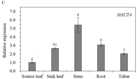Relative expression of StSUT1 (A), StSUT2 (B), and StSUT4 (C) in different tissues of potato plants by qPCR. According to Duncan’s multiple range test, the same letters are not significantly different at p ≤ 0.05.