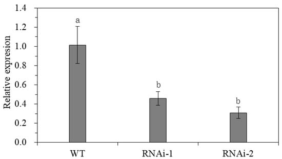 StSUT2 expression level in the leaf of StSUT2-RNA interference lines. According to Duncan’s multiple range test, the same letters are not significantly different at p ≤ 0.05.