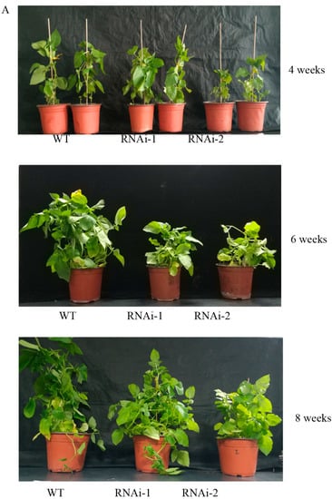 The potato (Solanum tuberosum L.) ‘Shepody’ cultivar and its StSUT2-RNAi transgenic plants (RNAi-1 and RNAi-2 lines) grown in our laboratory in 2019 were used throughout this study. The construction of RNAi transgenic plantlets was completed using the previous study of our lab []. Freshly single-node explants were cultured in standard tissue culture media Murashige and Skoog to obtain completely regenerated plantlets before further experiments. Four weeks after the subculture, in vitro plantlets were transferred to plastic pots (13 cm in diameter and 15 cm in depth) containing vermiculite (with four plants per pot). Plants were maintained in greenhouse conditions with a 16 h photoperiod (400 μmol photons m−2s−1) following a 24/20 °C light/dark cycle with 70% ± 5% relative humidity. Seedlings were watered daily and fertilized once a week with 25% Hoagland nutrient solution []. The phenotypic analysis was conducted after plants were cultured for 4, 6, and 8 weeks. In addition, the 4-week-old plantlet parietal leaflets of the top third of the compound leaves were excised and were immediately frozen in liquid N2 and stored at −80 ℃ for RNA extract (Figure 1).