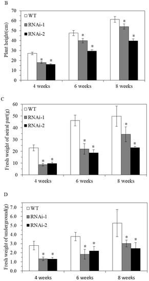 The phenotype of StSUT2-RNA interference plants (A) and its plants height (B) and fresh weight of the aerial (C) and underground parts (D). Plants were monitored within 4 weeks, 6 weeks, and 8 weeks of time duration. “*” means the difference is statistically significant between RNAi lines and WT.