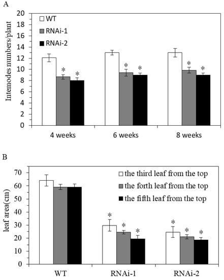 StSUT2-RNAi interference negatively affects the internode numbers (A) and leaf area (B). Leaf samples were taken at the third, fourth, and fifth leaves from the top of the plants. “*” means the difference is statistically significant between RNAi lines and WT.
