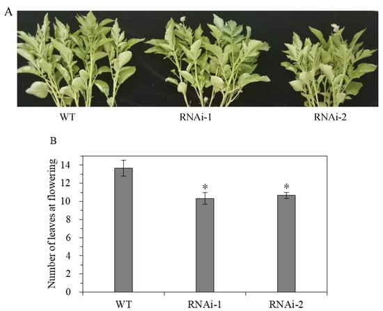 Flowering time (A) and the number of leaves at the flowering time (B) are significantly affected by StSUT2-RNAi. “*” means the difference is statistically significant between RNAi lines and WT.