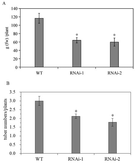 The results show that StSUT2-RNAi affects the flowering time and tuber yield during potato ‘plant’ growth and development. StSUT2-RNAi plants flowered 4 to 6 days earlier than that of the WT (Figure 6A). In addition, the number of leaves at the flowering time of the StSUT2-RNAi plants was significantly less than that of the WT plants (Figure 6B). The analysis showed that there were 3 to 4 leaves more leaves by the WT plants in comparison with the StSUT2-RNAi. The average yield of the harvest tubers from the WT potato plants was 116.9 g, while the yields from the StSUT2-RNAi-1 and -2 potato plants were 64.1 g and 59.7 g, respectively, almost two times less in comparison to the WT potato yield. The StSUT2-RNAi plants displayed a strong reduction in tuber yield and numbers compared to the WT plants (Figure 7A,B). In contrast to the yield and tuber numbers, there was no significant difference in the average weight of a single tuber found between the WT and StSUT2-RNAi plants at maturity (Figure 7C). The average weight of a single potato tuber in the WT, RNAi-1, and RNAi-2 plants was 39.3 g, 30.7 g, and 34.4 g, respectively.