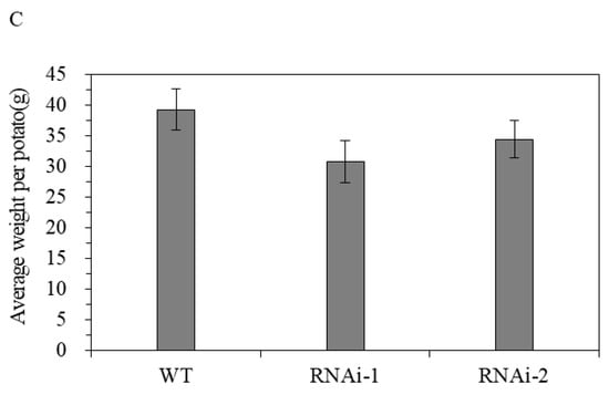 Effects of StSUT2-RNAi on potato tuber yield (A), number (B), and size (C). “*” means the difference is statistically significant between RNAi lines and WT.