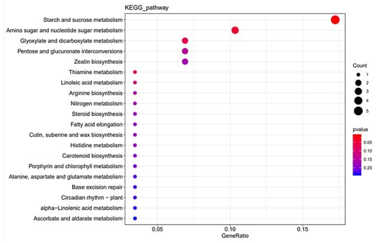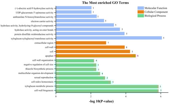 The RNA-seq data provides a foundation for elucidating the differentially expressed genes (DEGs) between StSUT2-RNAi-2 and WT plants. In total, 152 DEGs were detected, with 128 upregulated and 24 downregulated genes with a fold change of ≥2 or ≤− 2 relative to the WT (Figure 8 and Table S2). To explore the possible functions of the DEGs, the gene ontology (GO) and Kyoto Encyclopedia of Genes and Genomes (KEGG) databases were performed. The KEGG pathway class analysis of the DEGs revealed that the following two pathways were significantly enriched (p < 0.05): starch and sucrose metabolism and amino acid and nucleotide sugar metabolism (Figure 9, Table S3). The enriched KEGG pathway “starch and sucrose metabolism” has five genes: PGSC0003DMG400020589 (UDP-glucuronate 4-epimerase 6), PGSC0003DMG400011222 (UDP-glucuronate 4-epimerase 1), PGSC0003DMG400015933 (pectinesterase/pectinesterase inhibitor PPE8B-like), PGSC0003DMG400031816 (pectinesterase/pectinesterase inhibitor 41), and PGSC0003DMG400029738 (β-xylosidase/alpha-L-arabinofuranosidase 2), whereas the enriched KEGG pathway “amino acid and nucleotide sugar metabolism” has three genes: PGSC0003DMG400011222, PGSC0003DMG40002973, and PGSC0003DMG400020589, and they overlap with the three genes from the “starch and sucrose metabolism” pathway. Interestingly, these genes are totally involved in cell wall composition metabolism (Figure 9, Table 1). By the GO enrichment analysis, the 20 most significantly enriched terms (p < 0.01) are shown in Figure 10 (Table S4). After functional annotation, the DEGs in the nine terms are also involved in cell wall composition metabolism: “xyloglucan:xyloglucosyl transferase activity”, “hydrolase activity”, “hydrolyzing O-glycosyl compounds”, “UDP-glucuronate 5’-epimerase activity”, “apoplast”, “cell wall”, “extracellular region”, “cell wall organization”, “xyloglucan metabolic process”, and “cell wall biogenesis” (Figure 10). In total, 20 genes among 152 DEGs are relative to the cell wall composition metabolism; among them, 10 DEG expression levels were detected by qPCR in StSUT2-RNAi potato plants in order to test the accuracy of the RNA-seq data, which showed the express mode is similar between RNA-seq and qPCR, although the change fold is different (Table 1). The above results have indicated that the reduction of StSUT2 expression has caused changes in the gene expression levels of the cell wall composition metabolism.