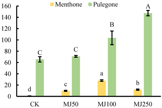 Variation of monoterpenoid content in Schizonepeta tenuifolia at different MeJA Levels. The uppercase letters and lowercase letters, respectively, represent the significant difference (p < 0.05) between the treatment groups of pulegone and menthone. CK 0 μM; MJ50 50 μM; MJ100 100 μM; MJ250 250 μM.