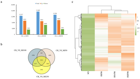 Using high-throughput RNA-sequencing, four gene libraries of 0 μM (CK), 50 μM (MJ50), 100 μM (MJ100) and 250 μM (MJ250) were established to screen differentially expressed genes between the MeJA-treated and unsprayed groups according to the expression level of each gene. We identified a total of 24,694 DEGs, including 12,557 for CK VS MJ50, 15,409 for CK VS MJ100, and 13,286 for CK VS MJ250 (Figure 2). We found the number of DEGs was the largest by comparing CK with MJ100, including 8965 up-regulated genes and 6444 down-regulated genes. However, there are the largest number of up-regulated genes between CK and MJ250 in each treatment group, which was 9695 genes. Additionally, compared with CK, the MJ50 condition had 9255 up-regulated and 3302 down-regulated DEGs. Meanwhile, there were 5362 up-regulated and 569 down-regulated DEG expressions after MeJA treatment (Figure S2), which indicated that some similar response mechanisms exist in plants in response to MeJA. In addition, we performed differential gene heat map analysis of 5362 up-regulated DEGs in both MJ50, MJ100 and MJ250 compared to CK (Figure 2c), which suggested unique gene expression in the MeJA treatment, indicating that the genes involved in transcriptional regulation varied under different MeJA conditions.