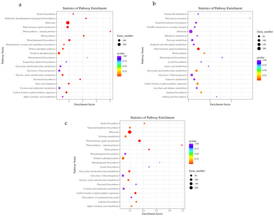 KEGG enrichment analysis of differential genes. (a) CK VS MJ50; (b) CK VS MJ100; (c) CK VS MJ250.