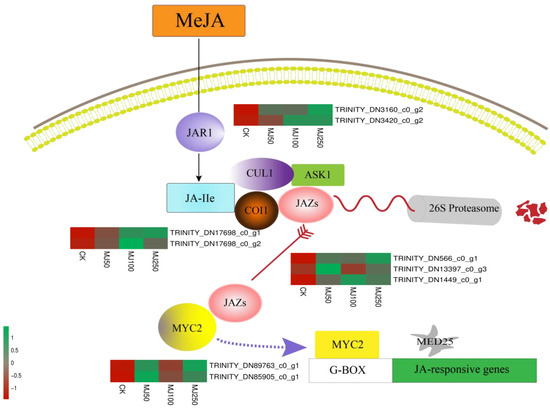 MeJA acts as a signaling molecule to which the plant organism can respond rapidly. In this study, the genes involved in JA signaling were identified and the expression patterns were analyzed under different concentrations of MeJA treatment (Figure 5). We identified two DEGs encoding jasmonate-amido synthetase (JAR1), their expression levels were up-regulated under MeJA treatment compared to the CK and reached the highest under MJ250 treatment with FPKM values of 3.97 (DN3160_c0_g2) and 5.39 (DN3420_c0_g2). The two DEGs encoding coronatin-insensitive 1 (COI1) had a similar expression pattern to JAR1, with expression levels upregulated in response to MeJA. Jasmonate ZIM domain (JAZ) proteins, as key regulators of jasmonate (JA) signaling, and the three encoded DEGs were all up-regulated genes. While the transcription factor MYC2 is the activator of downstream functional genes, the two encoded DEGs were expressed at different levels under different MeJA concentrations and were all up-regulated compared with the CK. It was worth noting that the expression level of MYC2 under MJ100 treatment was lower than that of the other two MeJA groups.