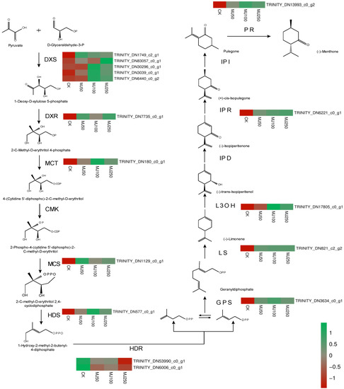 Monoterpenoid synthesis−related differentially expressed genes. Enzyme abbreviations: DXS 1−deoxy−D-xylulose−5−phosphate synthase; DXR 1−deoxy−D−xylulose−5−phosphate reductoisomerase; MCT 2−C−methyl−D−erythritol 4−phosphate cytidylyltransferase; MCS 2−C−methyl−D−erythritol 2,4−cyclodiphosphate synthase; HDS (E) −4−hydroxy-−3−methylbut−2−enyl−diphosphate synthase; HDR 4−hydroxy−3−methylbut−2−en−1−yl diphosphate reductase; GPS geranyl diphosphate synthase; LS (−)−limonene sythnase; L3OH Limonene−3−hydroxylase; IPR (−)−isopiperitenone redustase; PR pulegone reductase.