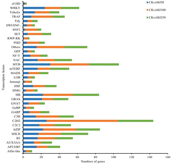 Transcription factors play an important role in plant growth and development, secondary metabolism and response to the external environment. Understanding the expression of transcription factors at different MeJA levels could provide a molecular basis for exploring the regulation of secondary metabolism in S. tenuifolia. A total of 887 differentially expressed transcription factors were identified from the four MeJA levels (Figure 7), of which the top five enriched transcription factor families were C2H2 (112), MYB (51), HB (43), bZIP (41) and bHLH (39). Analysis of the expression trend of the above transcription factors (Figure S3) showed that most of the transcription factors had high expression levels under MJ250 treatment, whereas they showed low expression levels in CK, MJ50 and MJ100. Most genes of MYB, HB, WRKY, bHLH and bZIP families were mostly up-regulated in expression level by MeJA, whereas C2H2 was mostly down-regulated. The GeBP family is involved in plant trichome development and growth, and we screened a total of five differentially expressed transcription factors of this family from transcriptome data, four of which were highly expressed at the MeJA level.
