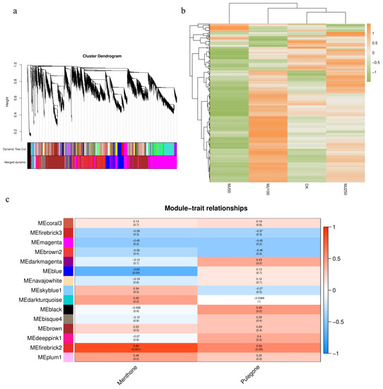 Weighted gene co-expression network analysis of the response of four MeJA−treated S. tenuifolia gene modules. (a) Gene hierarchy clustering dendrogram. Each color represents a module; (b) heat map analysis of ME firebrick 2 module gene clustering; (c) correlation analysis of gene modules with pulegone and menthone.
