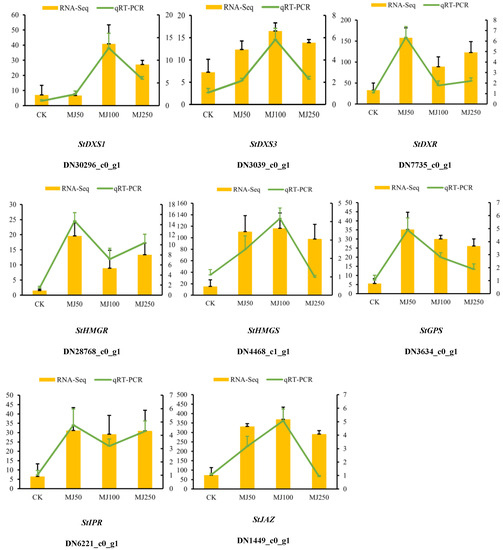 To verify the reliability of the transcriptomic data, we selected seven genes related to the synthesis of monoterpenoids and one gene related to JA signaling for qRT-PCR validation (Figure 9). The results showed that although there were some differences in expression ploidy, the expression pattern of the selected genes by qRT-PCR was generally consistent with the transcriptome data. The expression levels of all eight genes showed an increasing and then decreasing trend with increasing MeJA concentration. StDXS1, StDXS3, StJAZ and StHMGS had higher expression levels at MJ100, whereas the expression level of StHMGR, StIPR, StGPS and StDXR was MJ50. The qRT-PCR results demonstrated the reliability of the transcriptomic data, and thus the transcriptomic data could be useful for exploring the molecular mechanisms by which MeJA promotes the synthesis of monoterpenoids in S. tenuifolia.