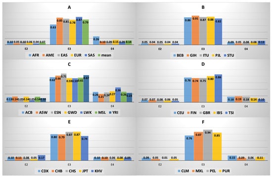 Distribution of APOE ε2, ε3 and ε4 isoforms: (A) across macroareas; (B) across the South Asian populations; (C) across the African populations; (D) across the European populations; (E) across the East Asian populations; (F) across the American populations.