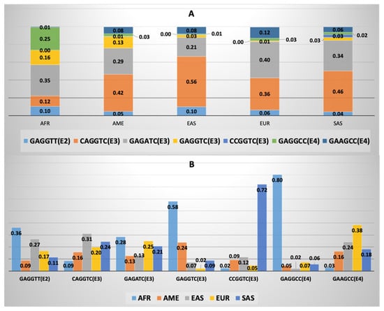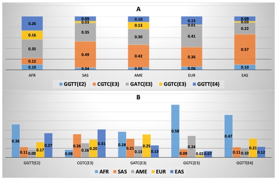 If the attention is focused specifically on variants that are polymorphic at least once in every single population of the 1KGP dataset, then only four variants emerge (rs440446, rs769450, rs429358, and rs7412) that compose a sub-cluster of the SNPs identified as shared across macroareas in the previous Section 3.4. These four variants carry alleles involved in the neurodegenerative and cognitive alteration of the individual (especially rs440446-G and rs769450-A), with an overlapping layer of cardiovascular and cerebrovascular ailments deriving especially from the ε2 and ε4 isoforms. Indeed, out of 24 = 16 possible combinations, there is only one haplotype carrying APOE ε2, while four carry isoform ε3 and three contain ε4 (Figure 4 and Supplementary Table S5). Three of the combinations, however, appear only once in the dataset: C-A-T-C (ε3 carrying the risk allele rs769450-A) in a Chinese Han individual from Beijing (CHB); G-A-C-C (ε4 and carrying both the causative mutations mentioned above) in a Mende, Sierra Leone sample (MSL); and C-G-C-C (ε4 but carrying none of the other neurodegeneration-associated mutations) in a South Asian individual from Bangladesh (BEB). Considering the remaining five combinations and their distribution across macroareas, it can be noticed how the AFR group exhibits a higher proportion of the ε2- and ε4-carrying haplotypes (10.3% and 26.3% of the overall AFR haplotypes, but they contribute to 26.3% and 46.6% of the respective haplotypes), and it provides more than half of the total ε3-carrying haplotype G-G-T-C found in the dataset, with 217 copies against a total of 375, or 57.9% (the AME macroarea is the second highest contributor, with 89 copies or 23.7%). On the contrary, the EUR macroarea seems to be particularly devoid of this specific sequence, as it appears only eight times overall; however, it is a significant contributor to another ε3 haplotype which carries both mutations associated with neurodegeneration, G-A-T-C (25.2%, just behind AFR with 28.2%), as well as the ε4-carrying sequence, G-G-T-T, with 20.8% of them coming from individuals of European ancestry. East Asian and South Asian populations particularly contribute to the ε3-including haplotype C-G-T-C (30.7% and 25.6% respectively), which does not carry any risk allele; indeed, this sequence makes up 48.9% of the South Asian and 56.9% of the East Asian total haplotypes (Figure 4 and Supplementary Table S5).