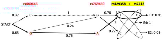If a simple step-by-step occurrence graph of the five common haplotypes is built as described in Section 3.4, one can notice that, having eliminated two alleles from the previously described six-variant haplotype, the situation has reversed: if the haplotype starts with the neutral allele rs440446-C, then the second position will always be occupied by another neutral allele, rs769450-G, while if the sequence starts with the causative allele, rs440446-G, then the second position will be taken by the also damaging allele rs769450-G 76% of the time, and the carried isoform will most probably be APOE ε3 (Figure 5).