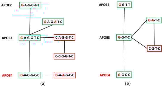 If a simple graph is built, where each successive node is one of the two possible alleles for every variant, and each edge carries the probability of going from one node to the next (where the probability is given by the frequency of the observed change in allele from one variant to the next), it can be easily seen that the edges with the highest probability (p = 1) are the ones stemming from an AD-related causative allele and connecting to the non-damaging allele of the next variant (Figure 3). Vice versa, the edges with the lowest probability are those going towards a causative allele (as low as 0.01), apart for the starting variant, which has a much higher probability for the damaging allele G, rather than its counterpart C. Indeed, the path with the highest probability produces the haplotype G-A-G-G-T-C, leading to an APOE ε3 isoform, although in our dataset, this combination of variants is not the most abundant by far (Figure 3).
