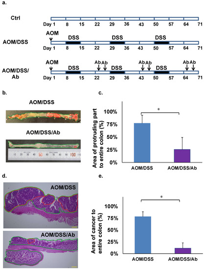 Photographs of whole colons from euthanized mice were stored on a computer. The area of the protruding part of the colon that might include cancer in the images was macroscopically examined by an animal pathologist. All tumor-like parts of the colon were macroscopically counted, and areas of tumor-like lesions were calculated using Image J (http://rsb.info.nih.gov/ij/, accessed on 29 August 2017) (Figure 1b,c). After confirming colon cancer in HE-stained slides, areas of cancerous lesions were histologically validated and calculated as (area of cancer/area of entire colon) × 100 (%) using Image J (Figure 1d,e).