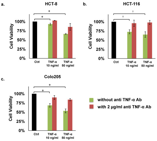Proliferation assays of colon cancer cells. (a) HCT8, (b) HCT116, (c) COLO205. Concentrations of TNF-α: 10 or 50 ng/mL. Concentration of human anti TNF-α Ab: 2 µg/mL. * p < 0.01, † p < 0.05.