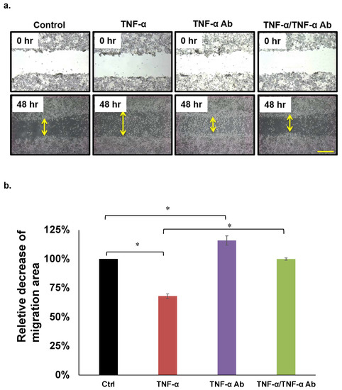 Cancer cell migration was determined using scratch assays as follows. Briefly, 2 × 105 cancer cells in 2 mL media/well were seeded in 12-well dishes; then, 50 ng/mL of TNF-α and/or 2 µg/mL of human anti TNF-α antibody were added to the wells. Confluent cell monolayers were scratched using Eppendorf pipet tips. Images of scratches were captured before and at 48 h after incubation in RPMI-1640 medium without FBS. Digital images of gap closure were acquired using a BZ-9000 microscope (Keyence, Tokyo, Japan). Migration areas were analyzed using ImageJ software, and data are presented as decreases in the average migration area relative to that of controls. The results were obtained from three independent experiments.