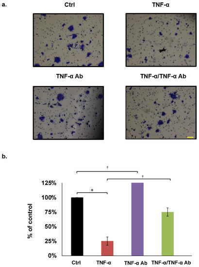 Invasion assays. (a,b) Representative COLO205 data. Concentrations of TNF-α and human anti TNF-α Ab are 50 ng/mL and 2 µg/mL, respectively. * p < 0.01, † p < 0.05. Scale bar represents 100 μm.