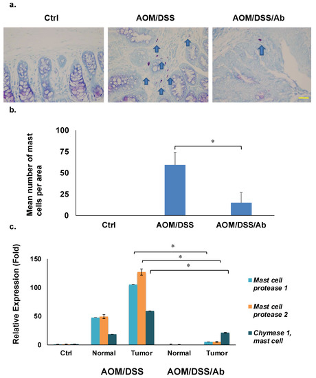 Table 2 shows several downregulated mast cell-related genes in the AOM/DSS/Ab group. We analyzed expression of the top three genes, Mcpt1, Mcpt2, and Cma1 using RT-qPCR to validate the microarray results. The mRNA expression of these genes was 100-, 125-, and 60-fold higher, respectively, in cancer tissues from AOM/DSS, than control mice, and infliximab significantly inhibited their expression compared to the control 5-, 5-, and 21-fold, respectively (p < 0.01; Figure 5c).