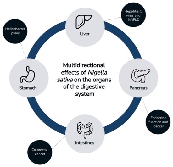 Nigella sativa L. (family Ranunculaceae), also known as black cumin, is an annual plant. It grows mainly in selected parts of Asia and southern Europe. The beneficial properties of black cumin were already known in ancient times [1]. It consists of non-volatile compounds, such as tannins or flavonoids, and volatile compounds, such as terpene compounds [2]. It shows a wide spectrum of activity in the food industry as a spice, as well as in the medical industry as a result of its antioxidant properties. The active compounds contained in Nigella sativa (NS) show strong pharmacological potential; this is why they can potentially be used as valuable components of drug-supporting therapies for various diseases [3]. In several scientific reports, researchers described the beneficial effects of black cumin on many diseases. By modulating the profile of inflammatory cytokines, NS shows antioxidant activity, even in chronic inflammatory conditions. It displays a wide spectrum of actions, for example, protective effects in cardiovascular diseases, i.e., high blood pressure, and showing hypolipidemic effects [4,5,6]. It has a positive effect in metabolic diseases, such as diabetes and obesity, and in various types of cancer, such as multiple myeloma and lymphoma [7,8,9,10,11]. In addition, immuno-, nephro-, and neuroprotective effects were reported [3,12,13]. NS also shows beneficial effects on the gastrointestinal tract, such as the stomach, pancreas, liver, and intestines. Due to the numerous medicinal properties of nigella, the main objective of this review was to present published scientific reports on the effects of NS on the gastrointestinal tract (Figure 1).