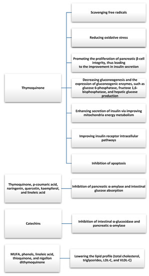 - Mahomoodally, M.F.; Aumeeruddy, M.Z.; Legoabe, L.J.; Montesano, D.; Zengin, G. Nigella sativa L. and its active compound thymoquinone in the clinical management of diabetes: A systematic review. Int. J. Mol. Sci. 2022, 11, 12111. [Google Scholar] [CrossRef]