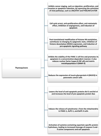 - Zhao, Z.; Liu, L.; Li, S.; Hou, X.; Yang, J. Advances in research on the relationship between thymoquinone and pancreatic cancer. Front. Oncol. 2023, 4, 1092020. [Google Scholar] [CrossRef]
