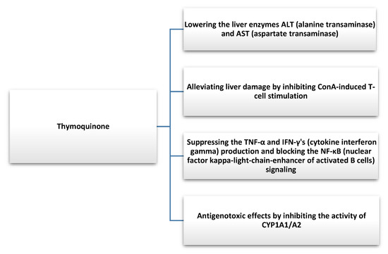 Hepatoprotective effect of thymoquinone found in Nigella Sativa [74,76].