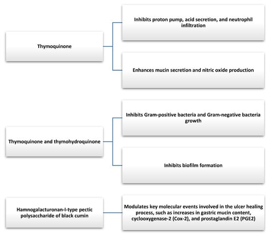 Helicobacter pylori (H. pylori) infection is one of the most common chronic bacterial infections associated with the development of gastritis and gastric ulcers [86]. In addition, it is one of the biggest risk factors for the development of gastric cancer and it was classified as a group I carcinogen to humans, which means there is convincing evidence of carcinogenicity in exposed humans. Additionally, there is evidence that H. pylori eradication in asymptomatic individuals reduces the risk of gastric cancer [86,87]. The antibacterial properties of NS, TQ, and thymohydroquinone were demonstrated in in vitro studies against both Gram-negative and Gram-positive bacteria [88,89]. NS also shows antimicrobial activity against some multidrug-resistant pathogenic bacteria [90].