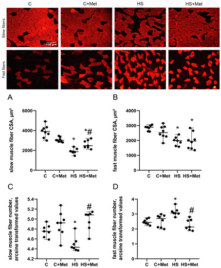 Figure 1. Cross-sectional area (CSA) of slow-type (A) and fast-type (B) fibers and the number of slow-type (C) and fast-type (D) fibers in rat soleus muscle. C, vivarium control, C+Met, vivarium control + metformin pre-treatment, HS, 7-day hindlimb suspension, HS+Met, metformin pre-treatment + 7-day hindlimb suspension. Scatter dot plots indicate median values, and the whiskers represent minimum and maximum values; n = 7–8/group. *: p < 0.05 vs. C, #: p < 0.05 vs. HS.