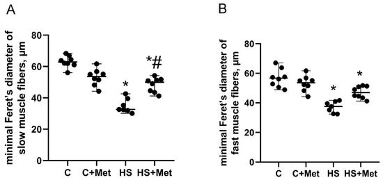 Figure 2. Minimal Feret’s diameters of slow-type (A) and fast-type (B) soleus muscle fibers. C, vivarium control, C+Met, vivarium control + metformin pre-treatment, HS, 7-day hindlimb suspension, HS+Met, metformin pre-treatment + 7-day hindlimb suspension. Scatter dot plots indicate median values, and the whiskers represent minimum and maximum values; n = 8/group. *: p < 0.05 vs. C, #: p < 0.05 vs. HS.