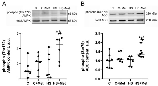 Figure 3. Effect of metformin pre-treatment on AMP-activated protein kinase (AMPK) (Thr172) phosphorylation (A) and acetyl-CoA carboxylase (ACC) (Ser79) phosphorylation (B) in rat soleus muscle. C, vivarium control, C+Met, vivarium control + metformin pre-treatment, HS, 7-day hindlimb suspension, HS+Met, metformin pre-treatment + 7-day hindlimb suspension. Scatter dot plots indicate median values, and the whiskers represent minimum and maximum values; n = 6–8/group. *: p < 0.05 vs. C, #: p < 0.05 vs. HS.