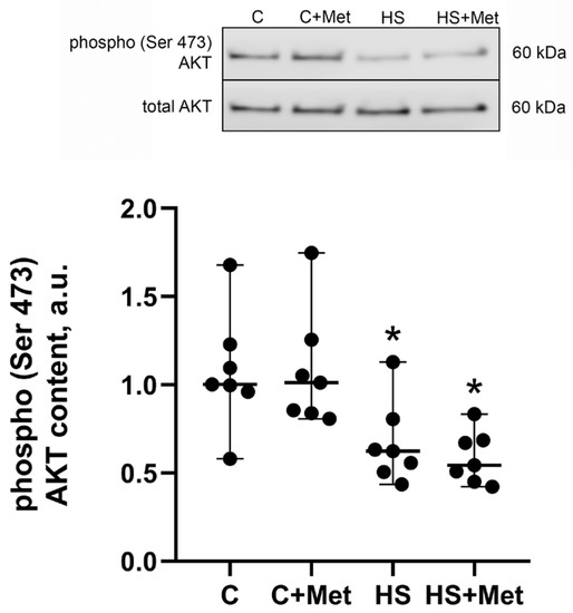 Figure 4. Effect of metformin pre-treatment on protein kinase B (AKT) (Ser473) phosphorylation in rat soleus muscle. C, vivarium control, C+Met, vivarium control + metformin pre-treatment, HS, 7-day hindlimb suspension, HS+Met, metformin pre-treatment + 7-day hindlimb suspension. Scatter dot plot indicates median values, and the whiskers represent minimum and maximum values; n = 7/group. *: p < 0.05 vs. C.