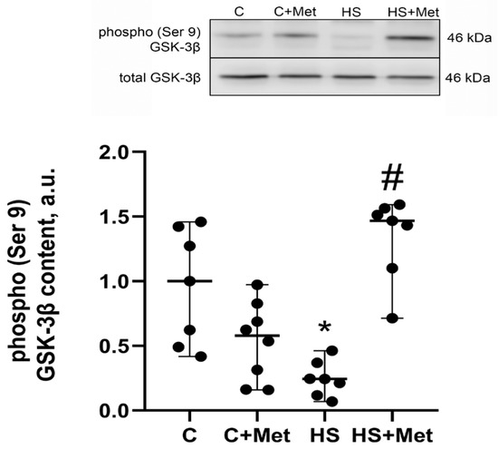 The level of glycogen synthase kinase-3β (GSK-3β) (Ser9) phosphorylation significantly decreased by 77% (p ˂ 0.05) in the HS group compared to the control group (Figure 5). However, in the HS+Met group, the level of GSK-3β (Ser9) phosphorylation did not differ from the control group and significantly increased by 124% (p ˂ 0.05) relative to the HS group (Figure 5).