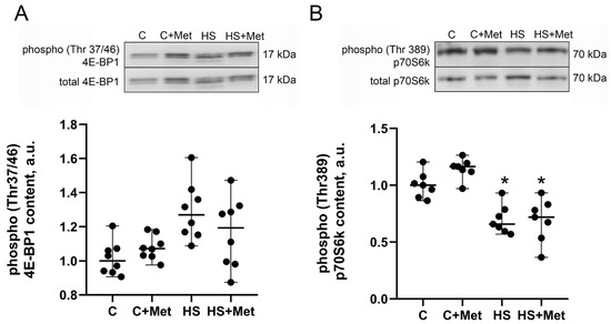 One of the key signaling molecules regulating protein synthesis is protein kinase mTORC1 [53]. The phosphorylation level of translation initiation factor 4E-binding protein 1 (4E-BP1) (Thr37/46), a well-known mTORC1 substrate, did not significantly change across the groups (Figure 6A). The phosphorylation level of another mTORC1 substrate, ribosomal protein S6 kinase beta-1 (p70S6K) (Thr389), significantly decreased by 33% and 27% (p ˂ 0.05) in the HS and HS+Met groups, respectively, compared to the control group (Figure 6B).