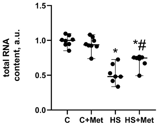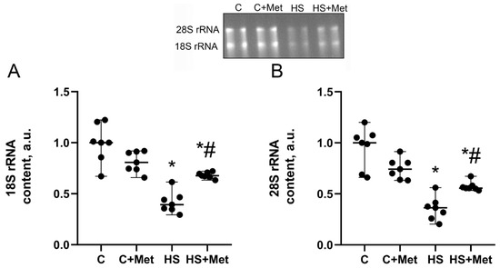 The content of 18S and 28S rRNAs significantly decreased by 60% and 65% (p < 0.05), respectively, in the HS group compared to the control group (Figure 8). In the HS+Met group, the content of 18S and 28S rRNAs significantly increased by 28% and 21% (p < 0.05), respectively, relative to the HS group, but remained lower than that in the control group (Figure 8).