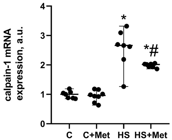 Calpains, calcium-dependent proteases, may play an important role in muscle atrophy development [54]. In the present study, calpain-1 mRNA expression significantly increased by 166% (p < 0.05) in the HS group compared to the control group (Figure 9). In the HS+Met group, calpain-1 mRNA expression significantly decreased by 65% (p < 0.05) relative to the HS group but remained elevated compared to the control values (Figure 9).