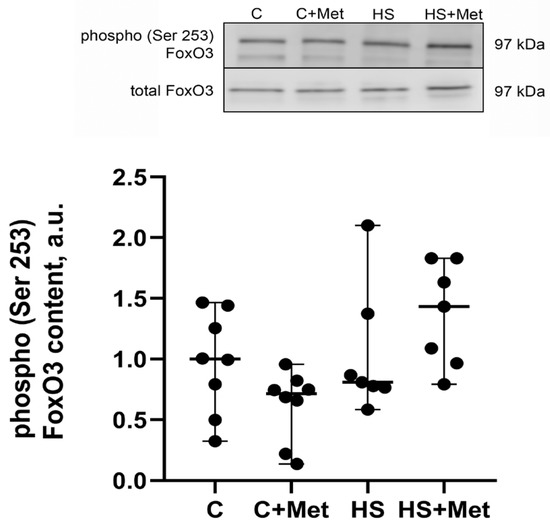 Figure 10. Effect of metformin pre-treatment on FoxO3 (Ser 253) phosphorylation in rat soleus muscle. C, vivarium control, C+Met, vivarium control + metformin pre-treatment, HS, 7-day hindlimb suspension, HS+Met, metformin pre-treatment + 7-day hindlimb suspension. Scatter dot plot indicates median values, and the whiskers represent minimum and maximum values; n = 7–8/group.