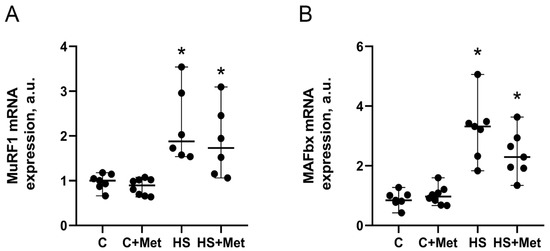 Figure 11. Effect of metformin pre-treatment on muscle RING finger 1 (MuRF1) (A) and muscle atrophy F-box (MAFbx/atrogin-1) (B) mRNA expression levels in rat soleus muscle. C, vivarium control, C+Met, vivarium control + metformin pre-treatment, HS, 7-day hindlimb suspension, HS+Met, metformin pre-treatment + 7-day hindlimb suspension. Scatter dot plots indicate median values, and the whiskers represent minimum and maximum values; n = 6–8/group. *: p < 0.05 vs. C.