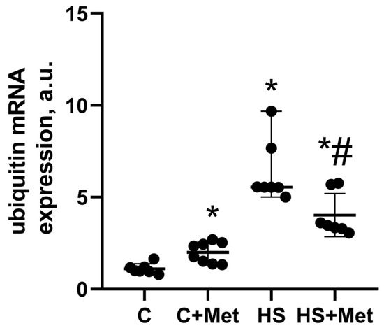 Figure 12. Effect of metformin pre-treatment on ubiquitin mRNA expression in rat soleus muscle. C, vivarium control, C+Met, vivarium control + metformin pre-treatment, HS, 7-day hindlimb suspension, HS+Met, metformin pre-treatment + 7-day hindlimb suspension. Scatter dot plot indicates median values, and the whiskers represent minimum and maximum values; n = 7–8/group. *: p < 0.05 vs. C, #: p < 0.05 vs. HS.