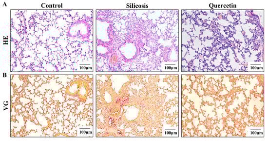 Quercetin inhibited the progression of silicosis in mice. (A) Hematoxylin–eosin staining of lung tissues (scale bar = 100 µm). (B) Van Gieson’s staining of lung tissues (scale bar = 100 µm).