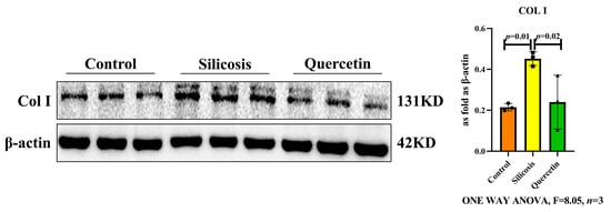 The lungs from the silicosis mice models stained with hematoxylin–eosin and van Gieson’s stains showed the formation of a cellular nodule and a Col deposition in the mice exposed to silica for 28 days (Figure 1). The Western blot results showed that the expression of Col I was significantly increased in the silicosis group, the same as the result of van Gieson’s stains (Figure 2). The pathological changes in the lung tissue were significantly alleviated and, in response to silica exposure, the lung functions were regained by quercetin treatment (Figure 3).