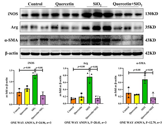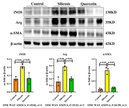 Macrophages are essential in lung defense, including in the pathogen clearance, immune regulation, and maintenance of homeostasis. Classically activated M1 (pro-inflammatory) and alternatively activated M2 (anti-inflammatory/pro-fibrotic) macrophages play different roles in lung damage, repair, and fibrosis. Western blot results showed that the expressions of iNOS, an M1-specific marker, and Arg, an M2-specific marker, were significantly decreased in the quercetin treatment group compared to in the silicosis group (Figure 4). The activation of α-SMA-positive myofibroblasts plays a key role in the silicosis process. The expression of α-SMA increased in the silicosis group, whereas in the quercetin group, it was suppressed(Figure 5).