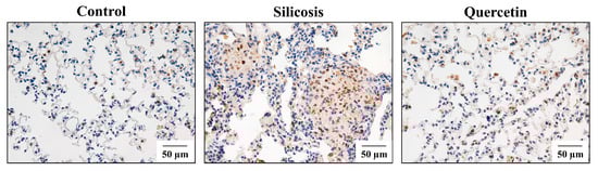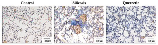 Eight-week-old male C57BL/6 mice were purchased from Vital River Laboratory Animal Technology, China. The study protocol was approved by the Committee on the Ethics of North China University of Science and Technology (LX2019033) and complied with the US National Institutes of Health Guide for the Care and Use of Laboratory Animals. The mice were randomly divided into three groups (n = 5) as follows: (1) the control group, subjected to a tracheal perfusion with 50 µL of 0.9% normal saline; (2) the silicosis group, subjected to a one-off non-invasive intratracheal instillation of silica suspension (100 mg/kg) (s5631; Sigma-Aldrich, St. Louis, MO, USA); and (3) the quercetin group, subjected to an intraperitoneal injection of quercetin (100 mg/kg) (Q4951, Sigma–Aldrich, Shanghai, China) every day for 28 days at the time of silica suspension (100 mg/kg) via a one-off non-invasive intratracheal instillation. The mice were sacrificed and part of the lung tissue was dehydrated and embedded in paraffin, while the remaining lung tissue was stored at −80 °C.