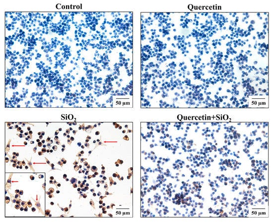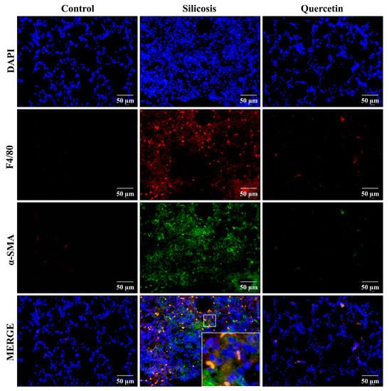 The MH-S cells were stimulated by SiO2 (50 µg/mL) for 24 h to allow macrophages to differentiate into similar myofibroblasts cells with a characteristic spindle shape and cytoplasmic extensions where α-SMA was abundantly present. The cells treated with quercetin were round or oval, with less cytoplasm. The α-SMA was significantly inhibited (Figure 8).